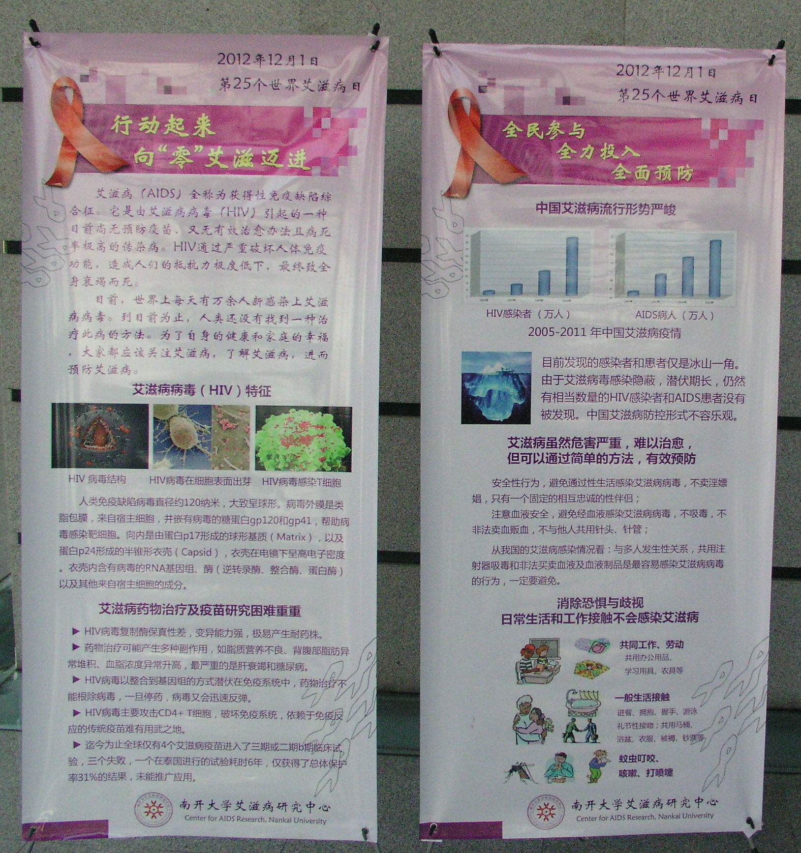 为了配合这一主题,南开大学艾滋病研究中心开展了系列学术和宣传活动。11月16日,该中心特邀美国内布拉斯加大学病毒中心主任Charles Wood教授为青年学子举办专题讲座,介绍世界特别是非洲地区艾滋病流行的严峻形势,以及艾滋病研究领域的最新进展。艾滋病研究中心乔文涛教授介绍了我国“十一五”实施“艾滋病和病毒性肝炎等重大传染病防治”科技重大专项取得的重要成果以及“十二五”的研究目标。同时,为了让全校师生更加全面、深入地了解艾滋病,该中心制作了宣传展板,介绍艾滋病毒的特征、目前药物治疗及疫苗研究的进展、中国艾滋病流行的形势和有效预防的措施,为师生解读了世界艾滋病日主题,普及了“防艾”的相关知识。