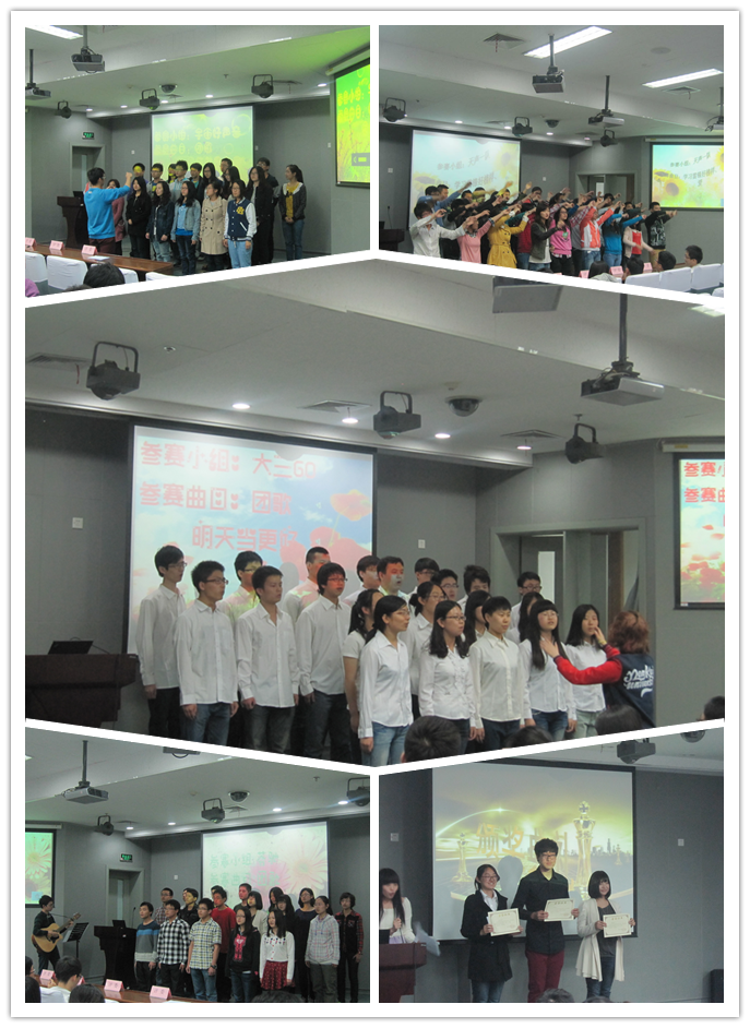 比赛分为制定曲目和自选曲目两部分,指定曲目有《中国共青团团歌》和《学习雷锋好榜样》。八支参赛队伍分别为2013级生科一班“且唱且珍惜”,2013级生科二班“生科二班”,2013级生技一班“亮剑队”,2013级生技二班“天声一队”,2013级伯苓班“苓驰”,2012级生物科学“Sunny”,2012级生物技术“宇宙好声音”,2011级代表队“大三go”。