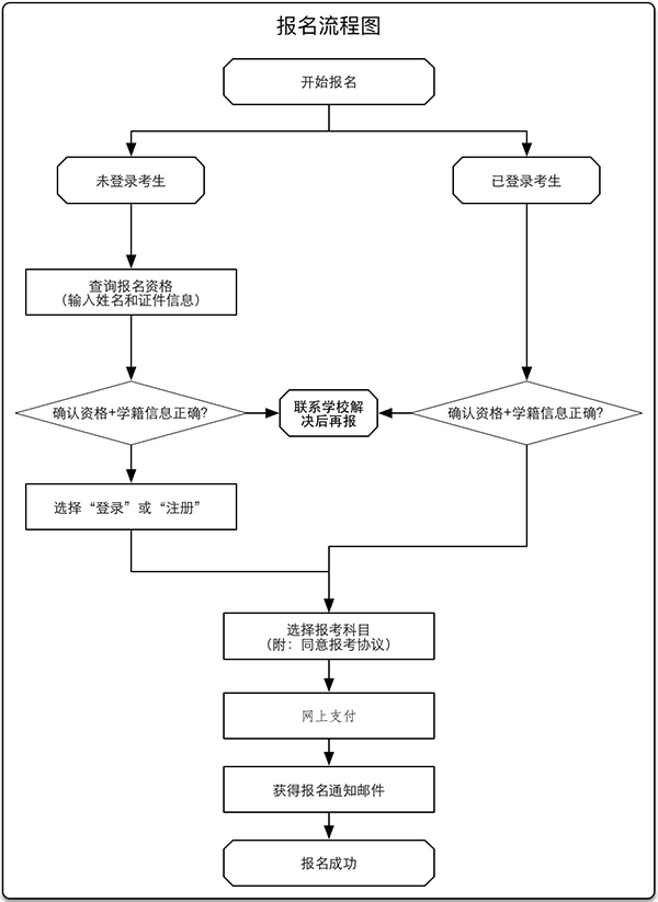 从本次考试开始,四六级外语考试全部实行网上报名。报名各阶段流程如下: