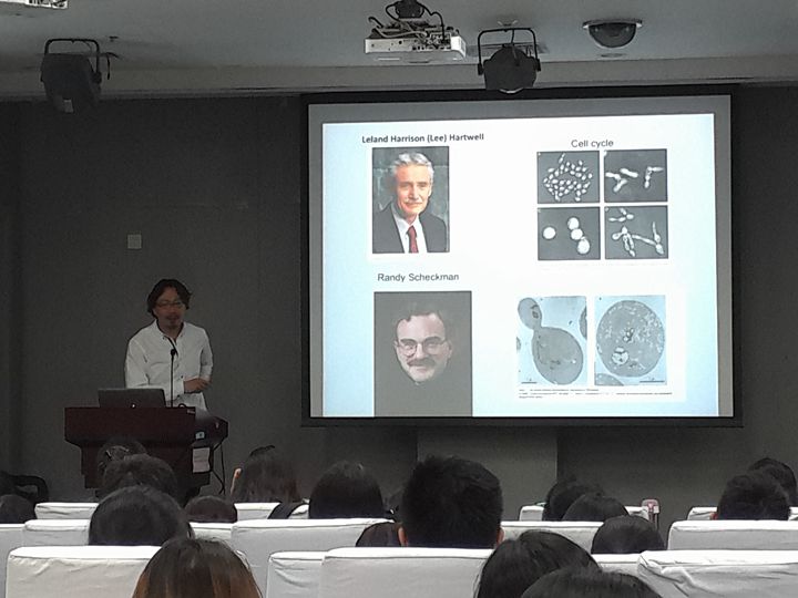 俞立教授首先介绍了细胞自噬的发现及最新的研究进展、细胞自噬的意义,并深度解读为什么细胞自噬可以获得诺贝尔奖?为什么大隅良典可以独立获得诺贝尔奖?Ohsumi在上世纪90年代时利用酵母作为一个遗传模型来研究这一现象,进而用酵母进行遗传筛选,进而找到了很多跟自噬相关的基因。这些过程对今后了解自噬的过程是非常重要的。Ohsumi不但是找到了这些基因,还分析了这些基因怎么在这些聚合体里起作用,他奠定了自噬的分子基础。
