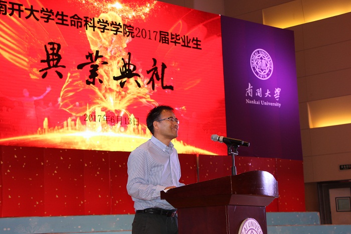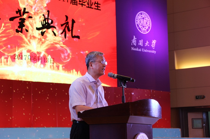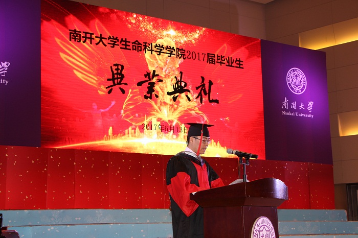 奏唱国歌仪式后,院长卜文俊教授上台致辞。首先祝贺2016届全体毕业生圆满完成了自己的学业,并感谢老师们、同学们几年来对于学院的付出。他要求毕业生牢记南开精神,践行公能校训,鼓励毕业生们去科学规划自己的人生,树立了目标后就要坚定不移,牢记南开校训,从容面对未来的挑战;他也希望大家去做一个懂得感恩的人,怀揣着感恩的心走上新的征程。
