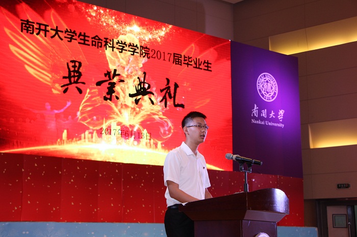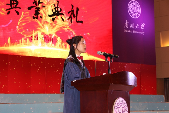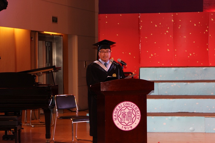 接着,王卓识、许广楠、张振国分别代表本硕博毕业生上台讲话。王卓识深情回忆了自己的大学生涯,谈到了在南开的收获和遗憾;许广楠结合自己在新疆支教的日子,谈到了自己对公能精神的理解,既有对母校的感谢,也表达出了一些建议;张振国博士曾经独自在野外度过了800天的科研生活,谈到这件事,他也是感慨颇多,在南开的科研生涯虽然辛苦,但是充实。三位毕业生代表都表达了对母校的眷念以及对未来生活的期待。