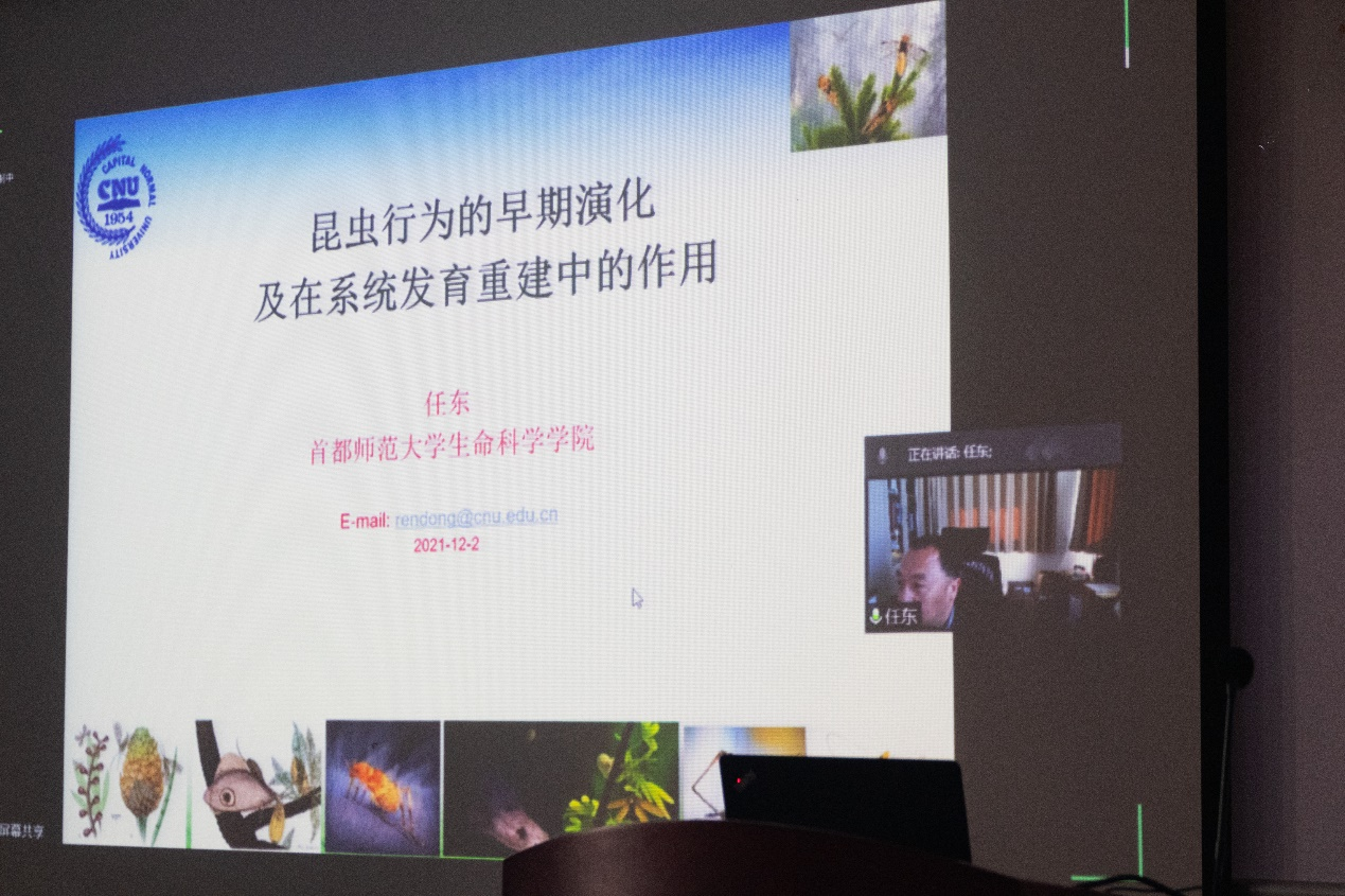 任东教授首先以“昆虫行为的早期演化及在系统发育重建中的作用”为题,介绍从化石中深入研究昆虫行为的早期演化过程。他首先提出昆虫的多样性与其行为的多样性密切相关,昆虫在与其他动植物的相互作用下,演化出了例如传粉取食、拟态防御、通讯发声等独特而多样的行为。比如传粉昆虫口器的长度与特定植物花粉管的长度相吻合,通过对化石中昆虫口器的形态研究,任东教授团队将被子植物的起源时间向前推进了3000-4000万年。任东教授在报告的最后总结了对于重建昆虫演化历史的意义与看法,为同学们日后的学习工作指出了新的方向。
