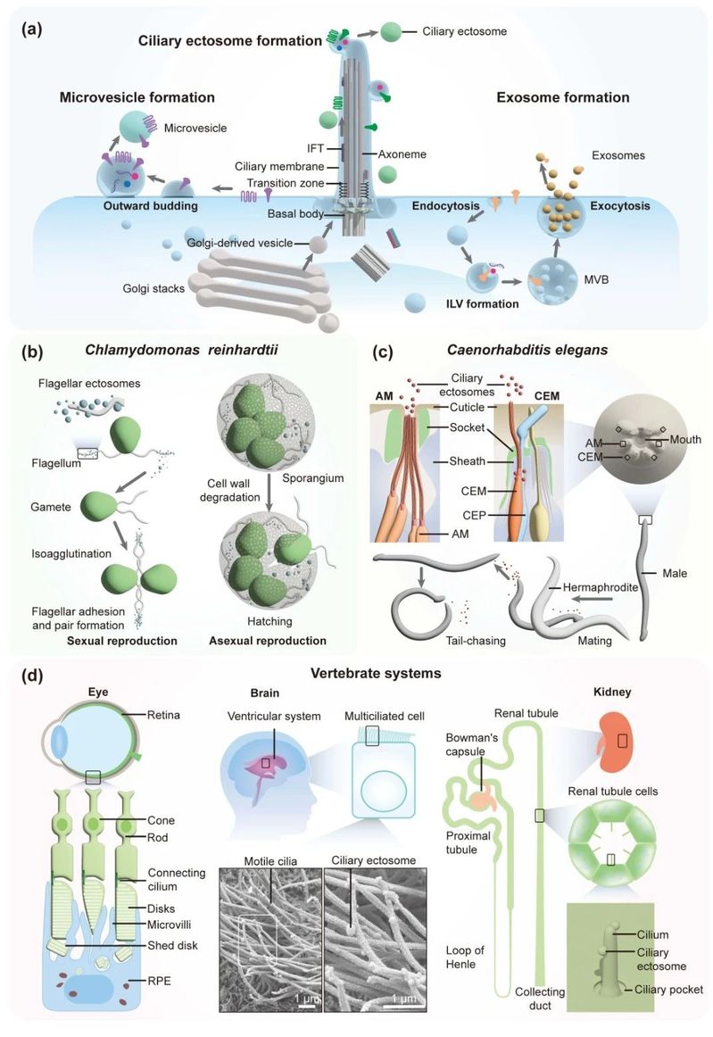 动物细胞同样也可以观察到纤毛外体的释放。研究人员通过组学手段分析纤毛外体的物质组成,发现哺乳动物细胞分泌的纤毛外体富含纤毛特异性分布的蛋白和脂质成分。在功能上,哺乳动物的纤毛外体参与了细胞周期依赖性的纤毛长度的调控。另外,在纤毛病患者的体液中也发现了一类富含纤毛特异性蛋白的胞外囊泡,尽管尚无直接证据表明这些胞外囊泡由纤毛释放,但是这一类特殊胞外囊泡的发现提示纤毛外体可能在相关疾病的发生发展过程中发挥作用。然而,相较于衣藻和线虫纤毛外体的研究,高等动物相关的研究由于研究体系复杂等原因仍有待进一步深入。