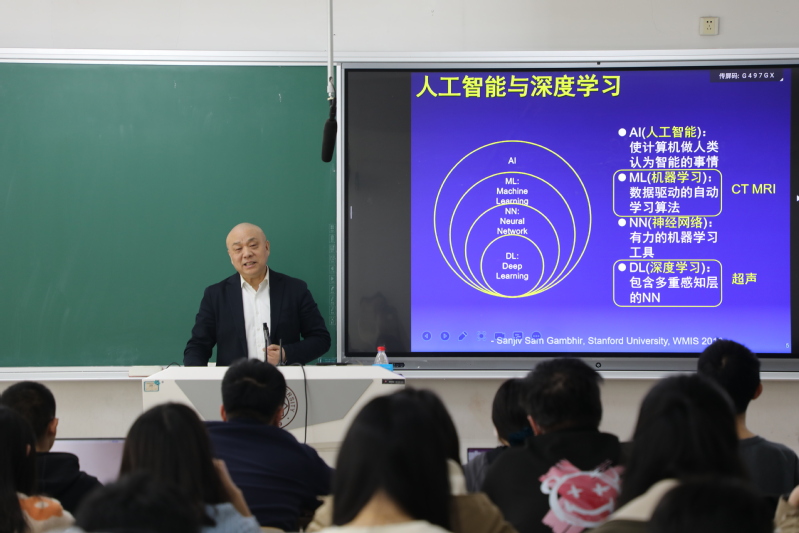 随后,田捷教授通过列举数十条实际临床案例,包括“早期肝癌手术的个体化决策”、“乳腺癌新辅助化疗的早期预测”、“超声标志物诊断胎儿唐氏综合症”等,生动地为同学们介绍了将人工智能应用于临床影像诊断的具体情况与优点。以“无创精准分期诊断肝纤维化”为例,通过人工智能定量解析超声成像结果,能有效判断肝纤维化患者是否存在病情恶化为肝癌的风险,帮助医生选择正确的治理方案。该方法精度高、无副作用、可长期监控,极大程度上避免了穿刺活检对病人带来的痛苦和自身的局域性。