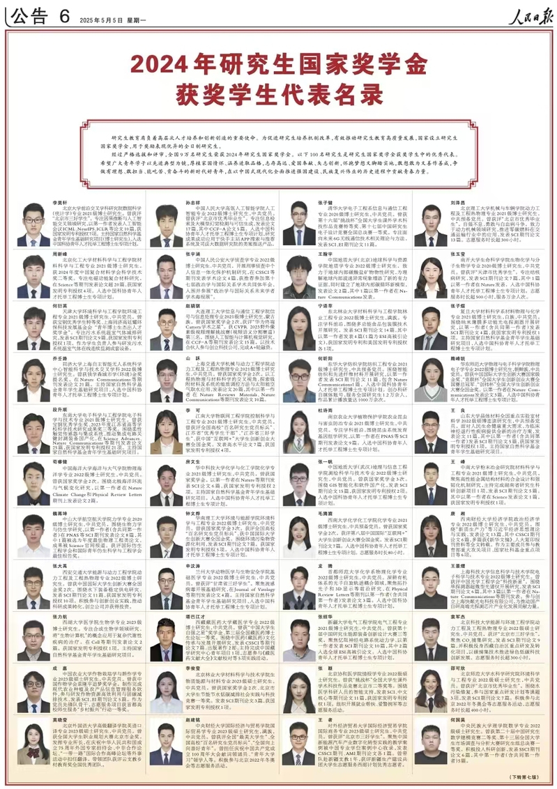 (通讯员:赵可欣)近日,《人民日报》专题刊发了2023-2024学年度国家奖学金获奖学生代表名录,集中展示了全国高校100名本专科生和100名研究生优秀代表。这些杰出学子分别从全国12万名本专科国家奖学金获得者及9万名研究生国家奖学金获得者中经过严格遴选脱颖而出。南开大学张玉莹凭借卓越的学术表现和科研成就荣登该名录。