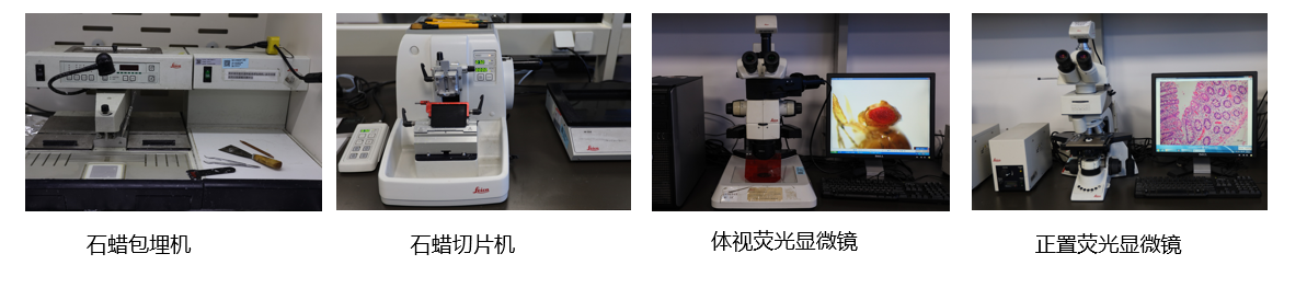 配备全套Lecia病理学仪器,包括全自动脱水机、石蜡包埋机、石蜡切片机2台、冰冻切片机、正置荧光显微镜及体视荧光显微镜